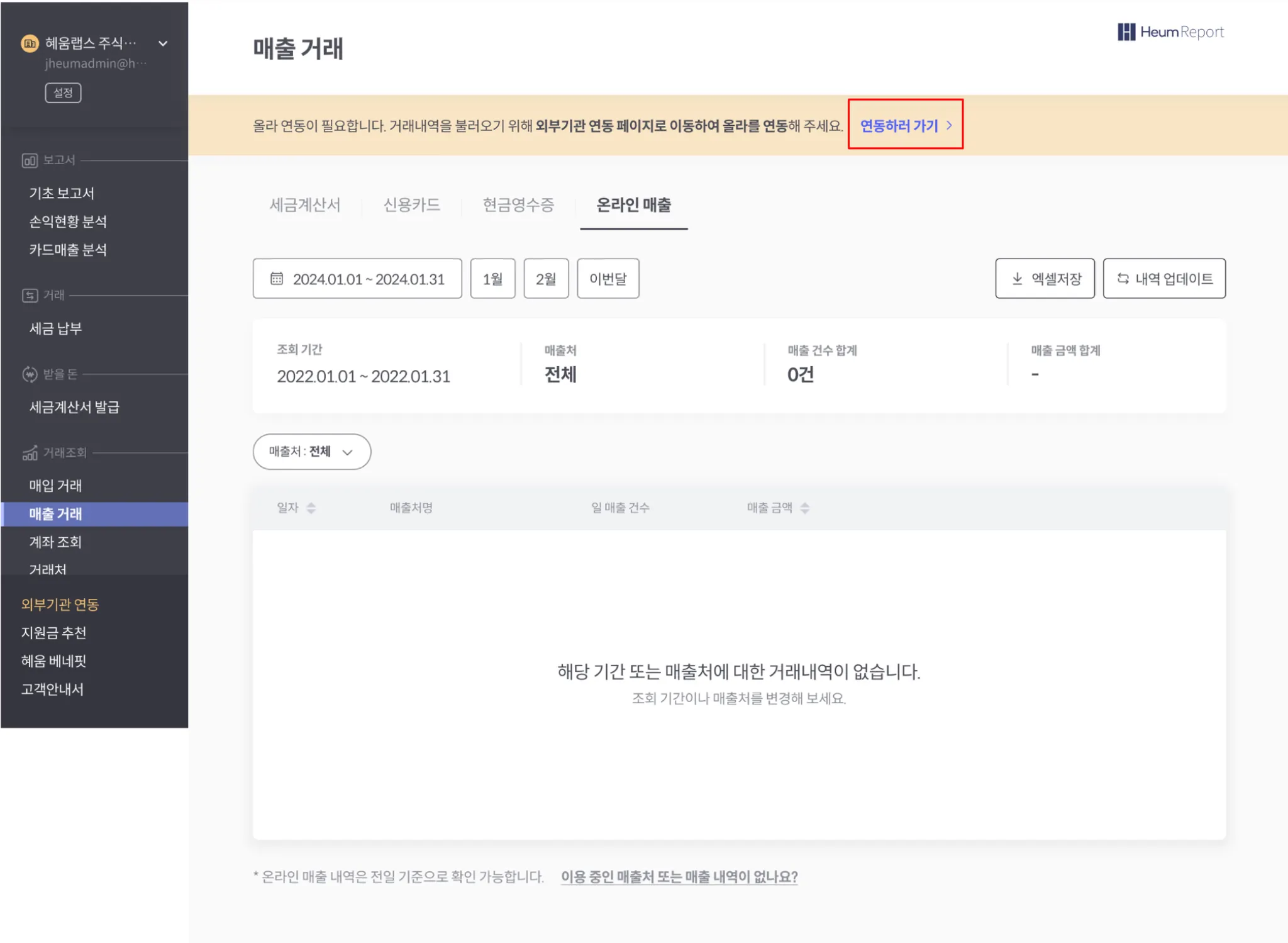 올라 서비스에 매출처 정보를 등록하지 않으면 ‘온라인 매출 내역’을 불러올 수 없습니다.
