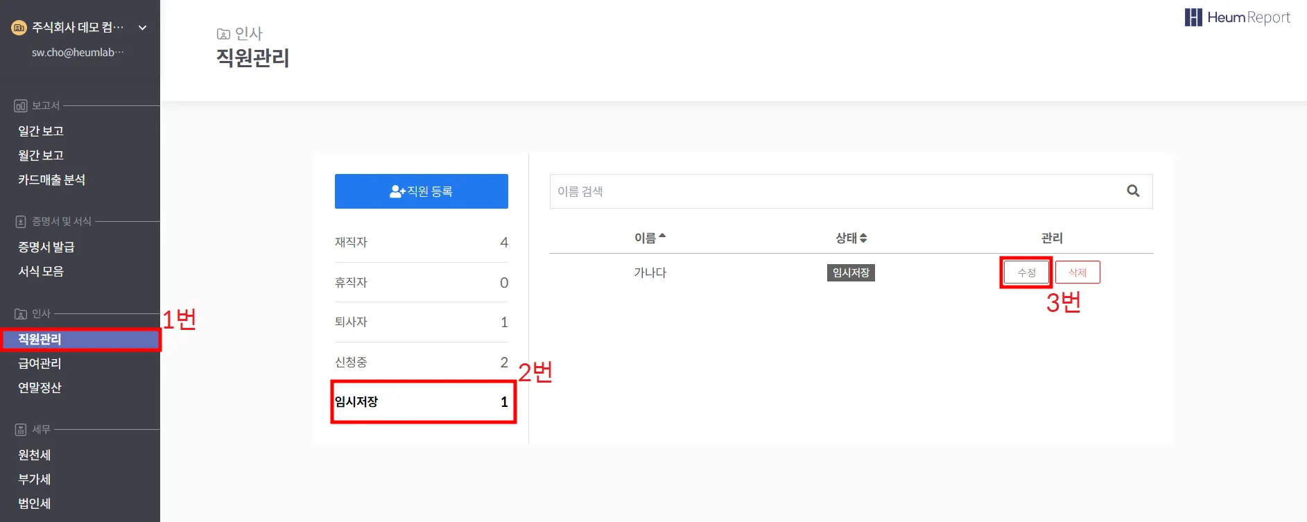 인사 > 직원관리 > 임시저장 에서 등록되어있는 직원들의 목록을 볼 수 있습니다.