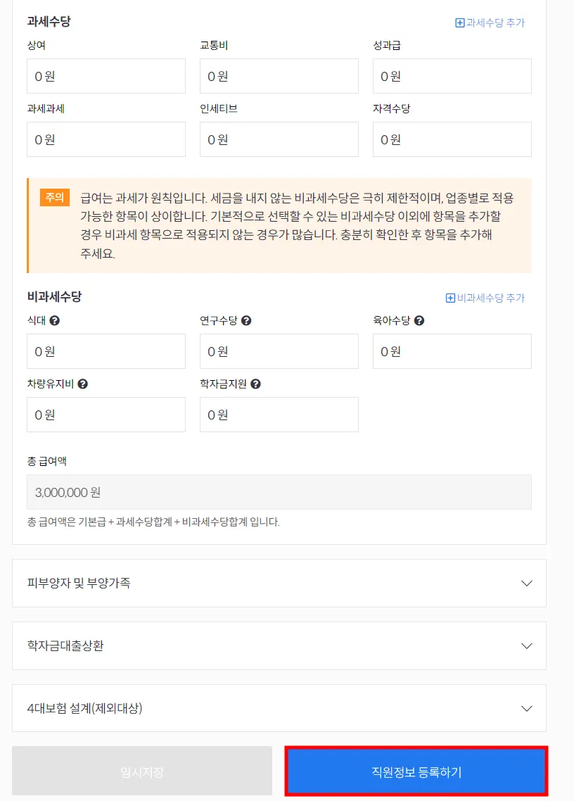 필수 정보를 추가로 입력 한 후 직원정보 등록하기 를 눌러 주세요. 직원 정보가 등록 됩니다.