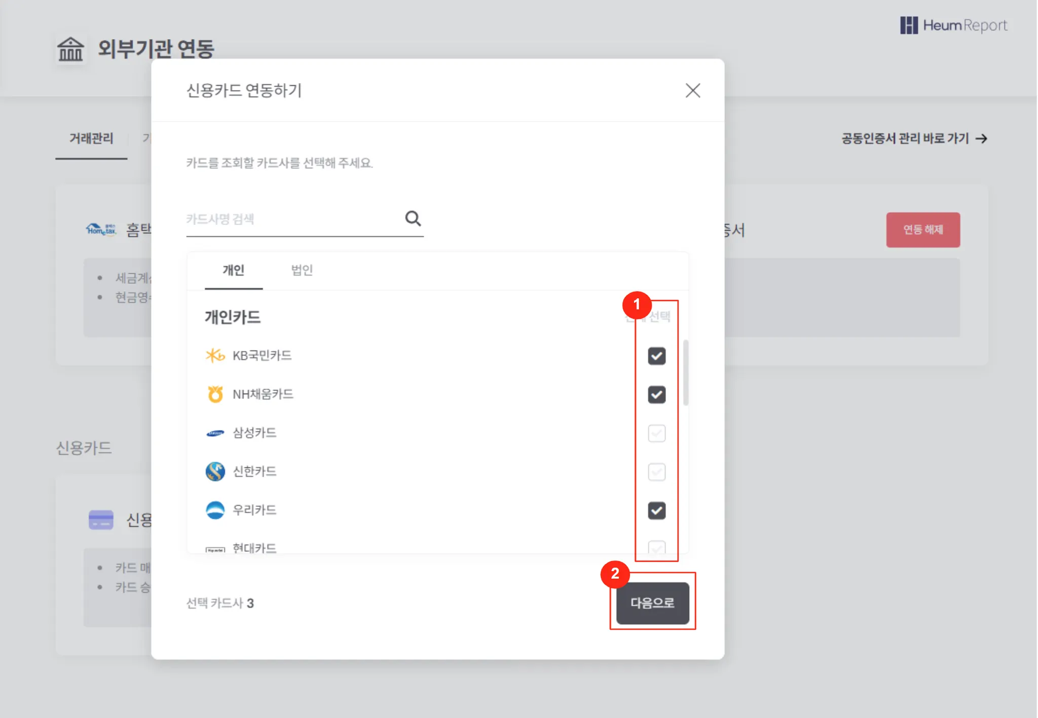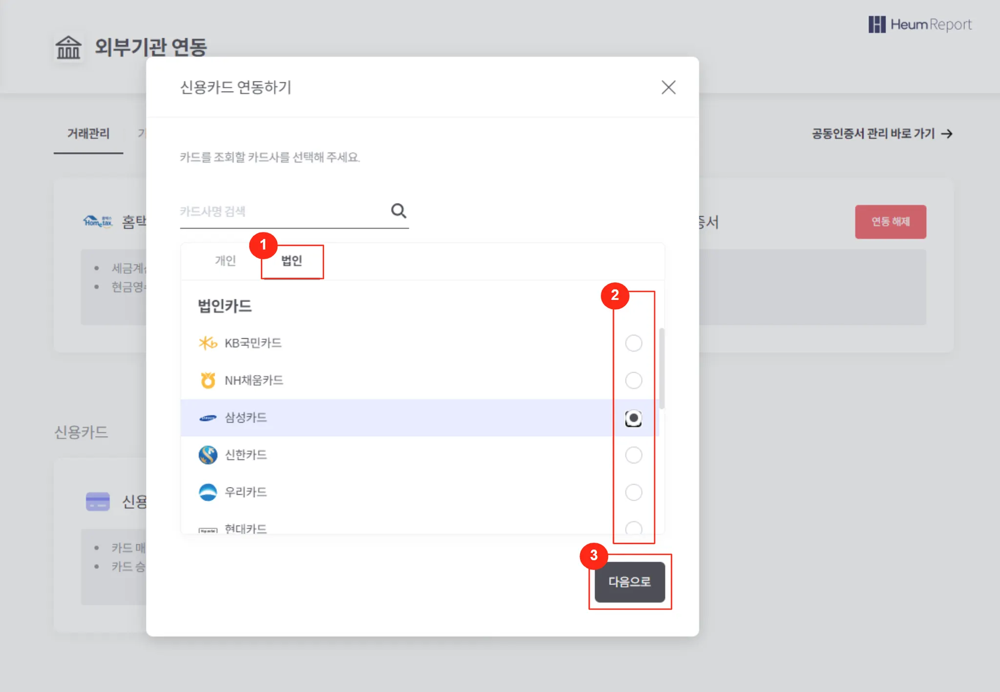 연동하고자 하는 카드사를 선택하고, 다음을 클릭 해주세요.