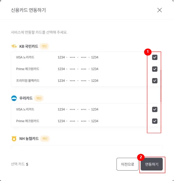 연동하고자 하는 카드를 선택하고, [연동하기] 버튼을 선택 해주세요.