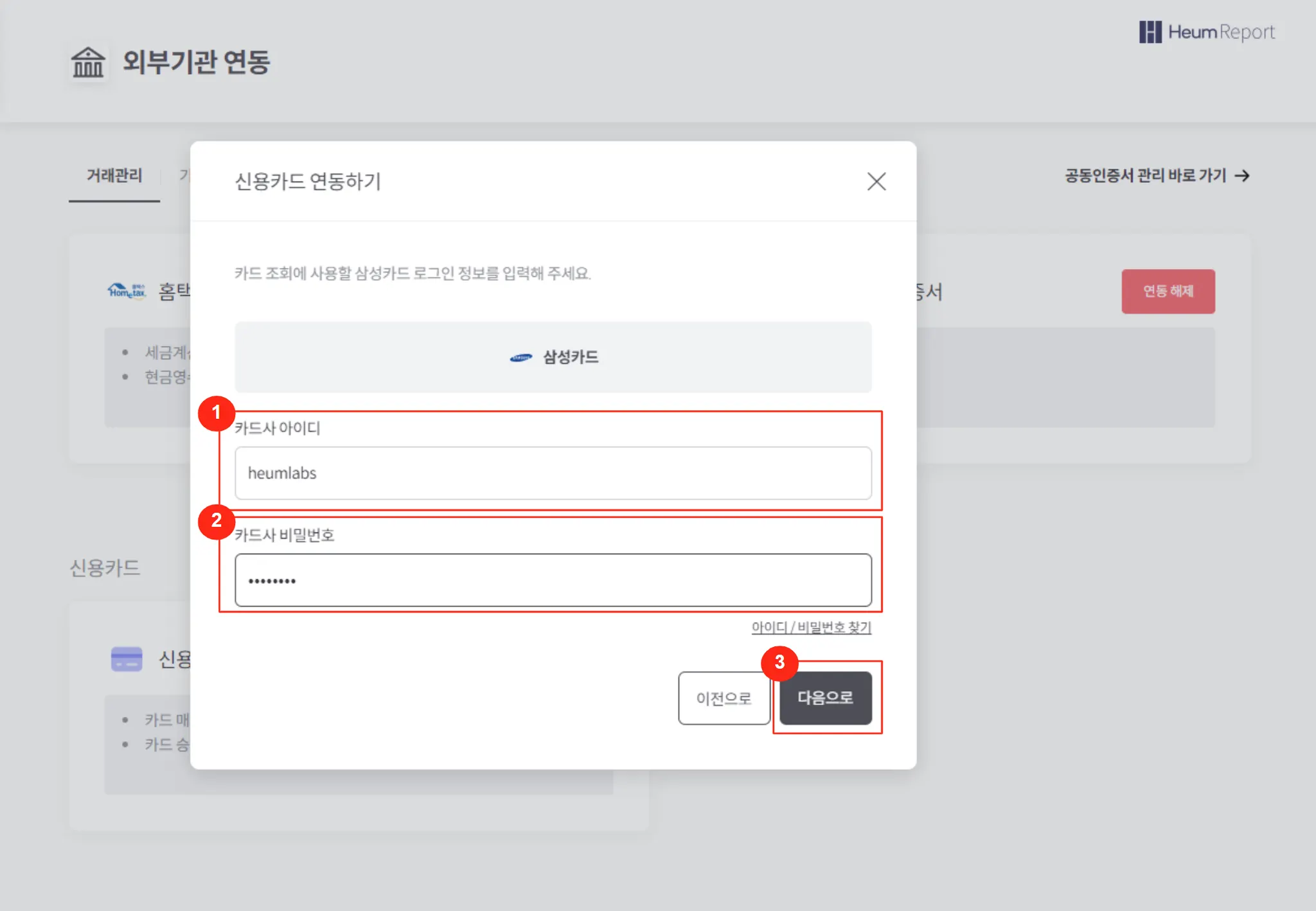 하나/롯데/삼성 법인 카드의 경우에는 인증서 연동을 지원하지 않기 때문에, ID/PW가 필요합니다.