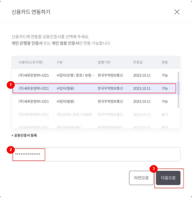 연동하고자 하는 인증서를 선택하고, 비밀번호를 입력 해주세요.