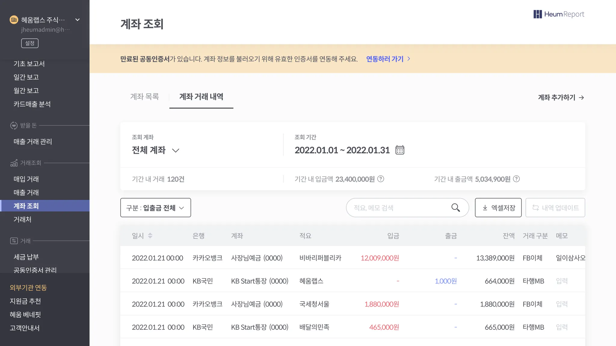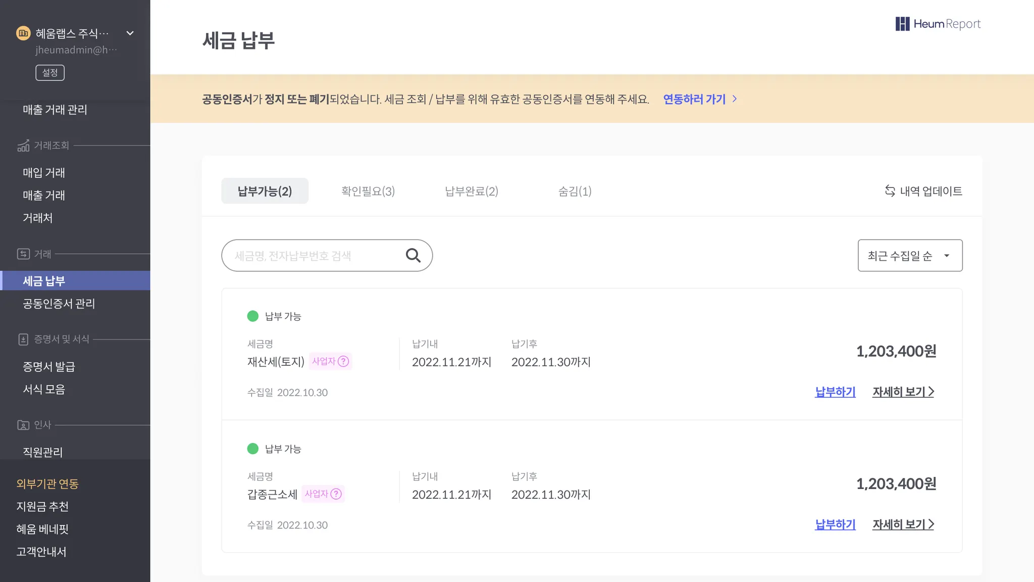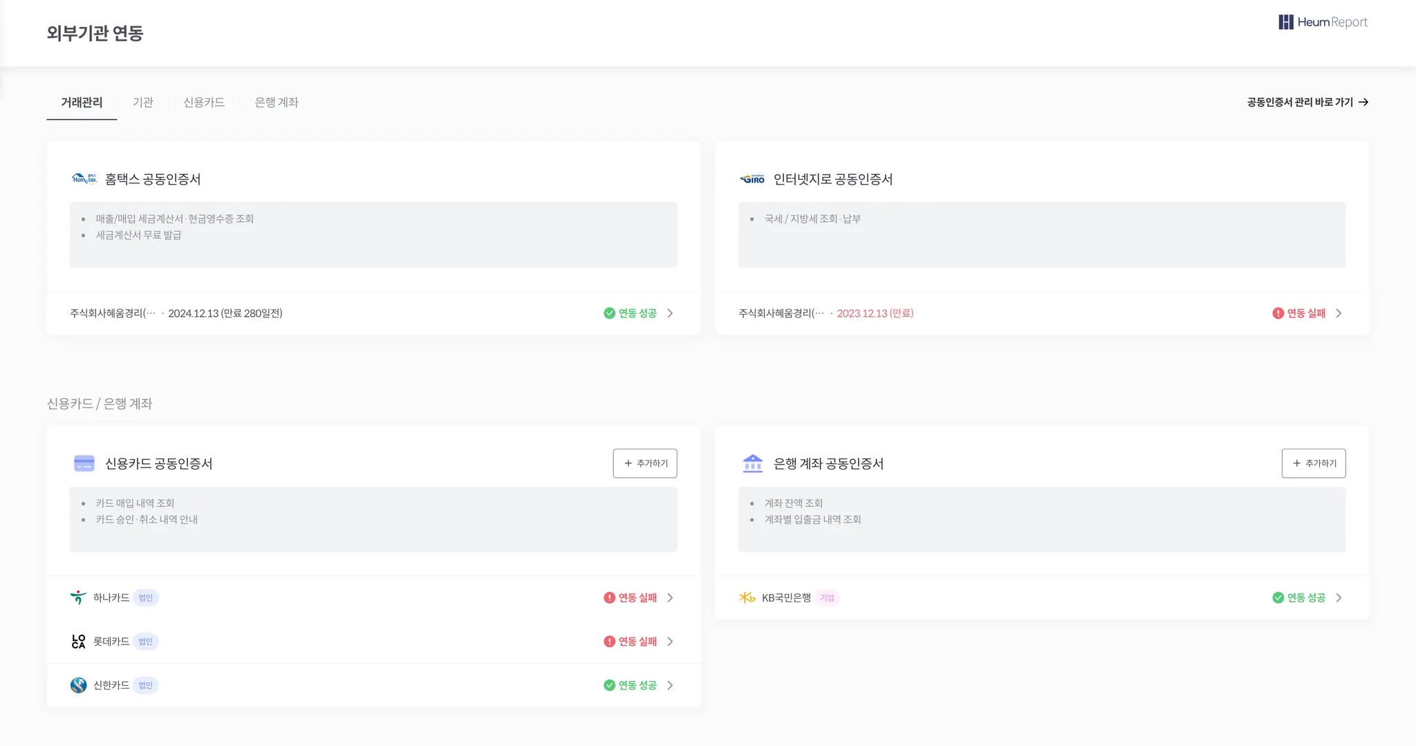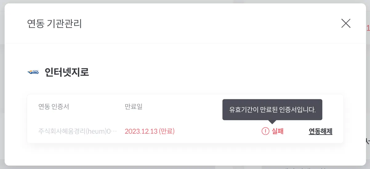 인증서 만료/폐기로 인해, 연동된 외부기관 관련 기능(ex. 거래 조회, 세금계산서 발급 등)이 정상 동작하지 않는 경우에