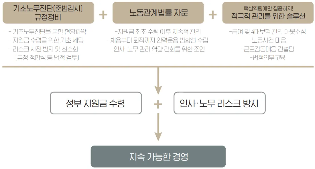 기초노무진단(준법감시) + 근로계약서·취업규칙 등 규정정비 + 정부 고용지원금 컨설팅