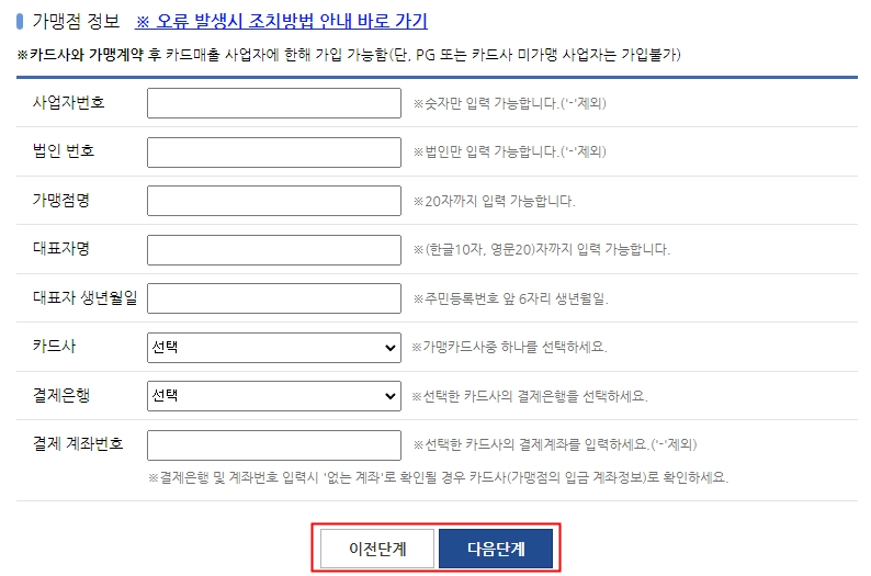 가맹점정보 입력 페이지로 이동 후,
