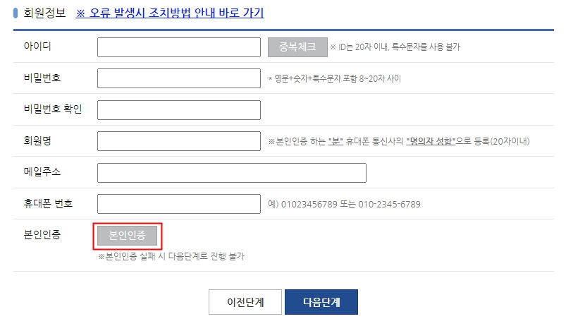 회원정보입력 화면에서 사용할 아이디와 비밀번호 등 정보를 입력한 후, [본인인증] 버튼을 클릭합니다.