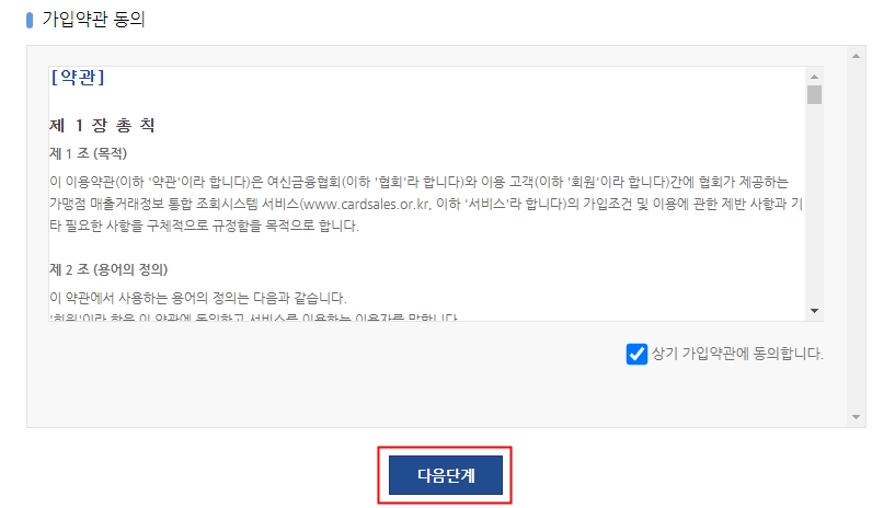 "개인정보 보호정책” 및 “가입약관"에 각각 동의 표시를 한 후, [다음단계] 버튼을 클릭합니다.