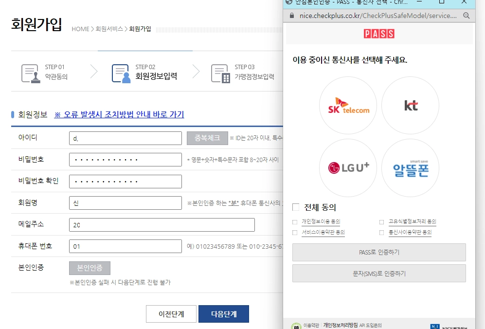 본인인증 단계에서 휴대폰명의자 정보로 본인인증하세요.