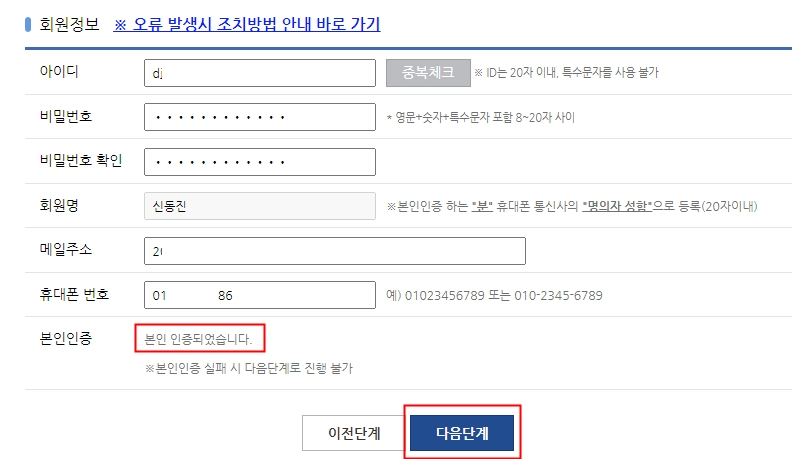 5. (인증완료 후) 회원정보입력 화면 복귀