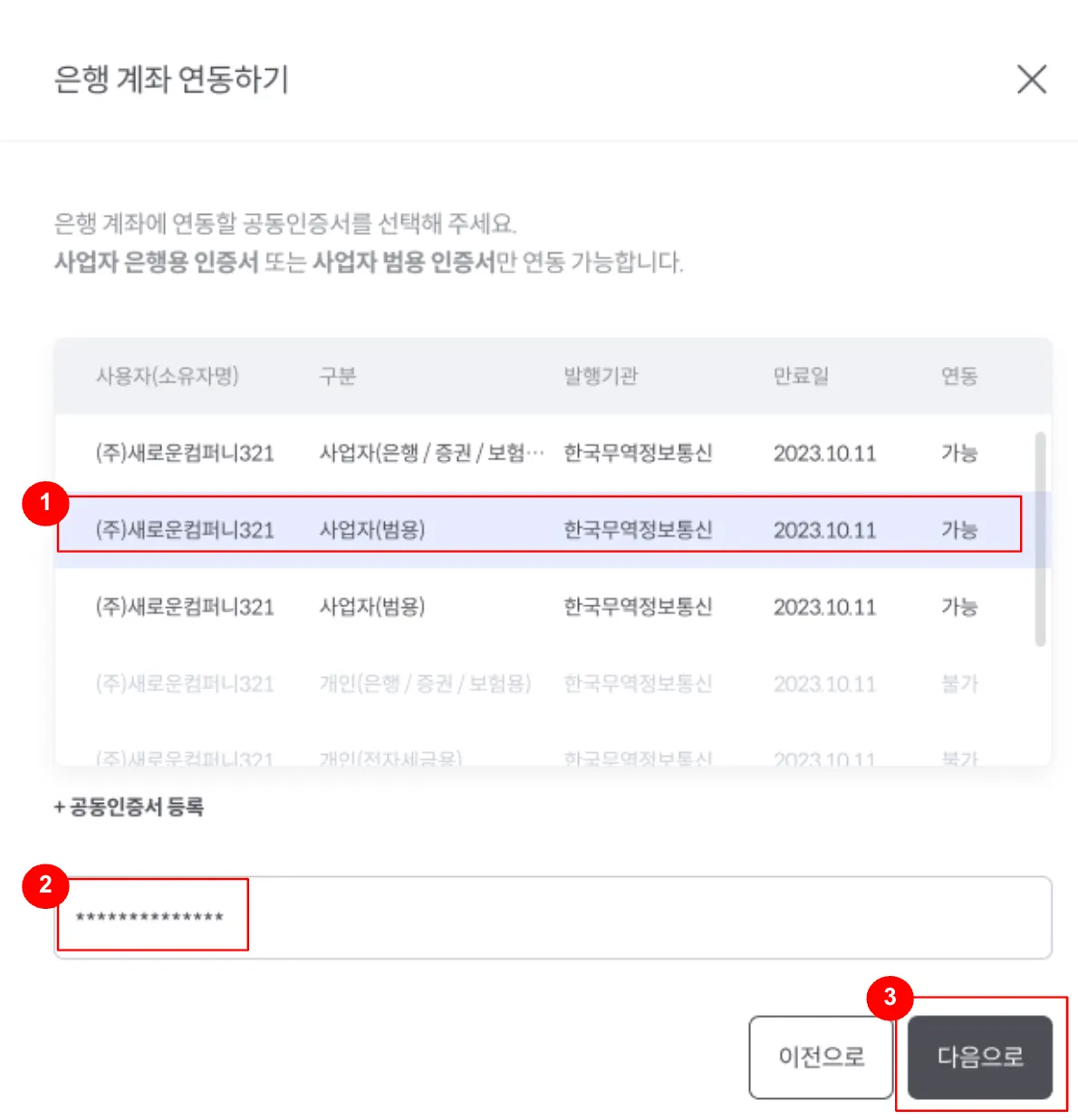 연동하고자 하는 인증서를 선택하고, 비밀번호를 입력 해주세요.