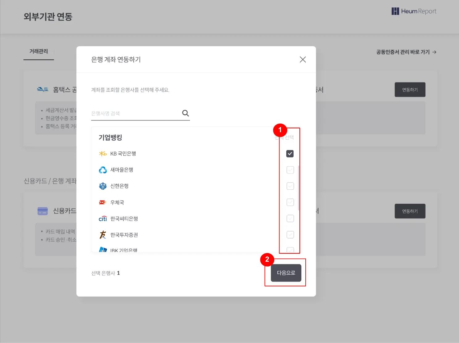 연동하고자 하는 은행사를 선택하고, 다음을 클릭 해주세요.