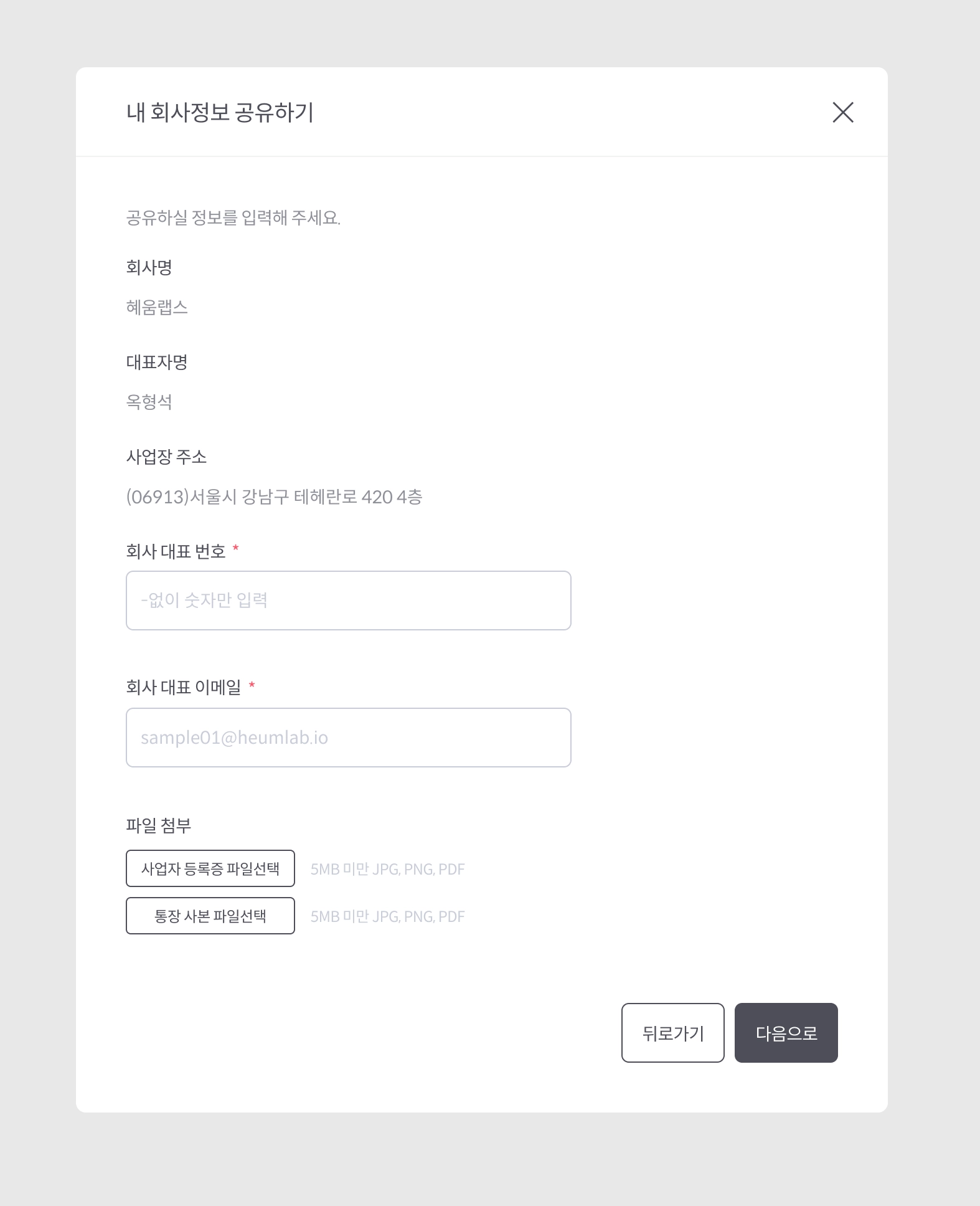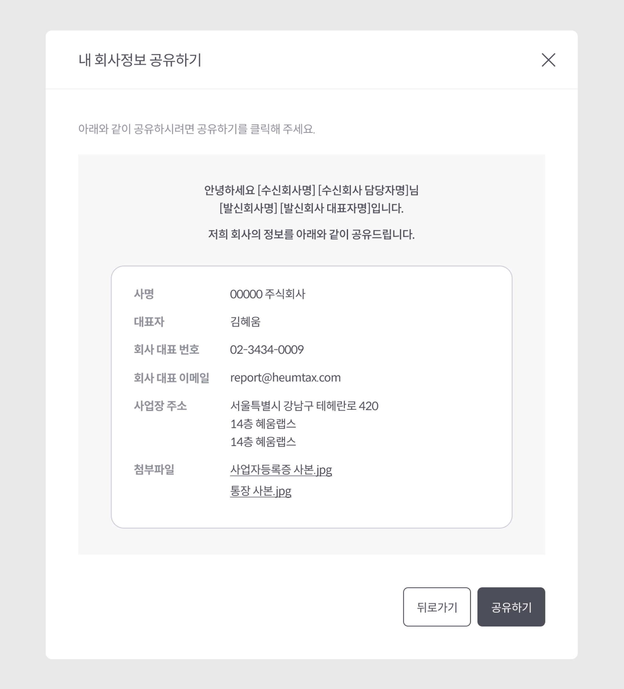 1. 내 회사정보 공유 버튼을 선택합니다. 내 회사정보 공유하기 팝업이 나타납니다.