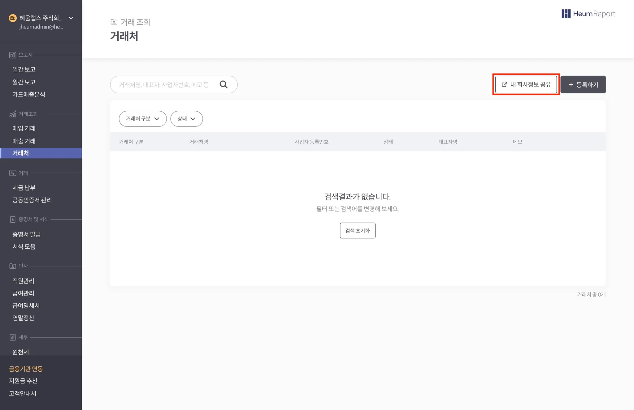 혜움 레포트 거래처 메뉴에서 내 회사정보를 공유하는 기능을 설명합니다.