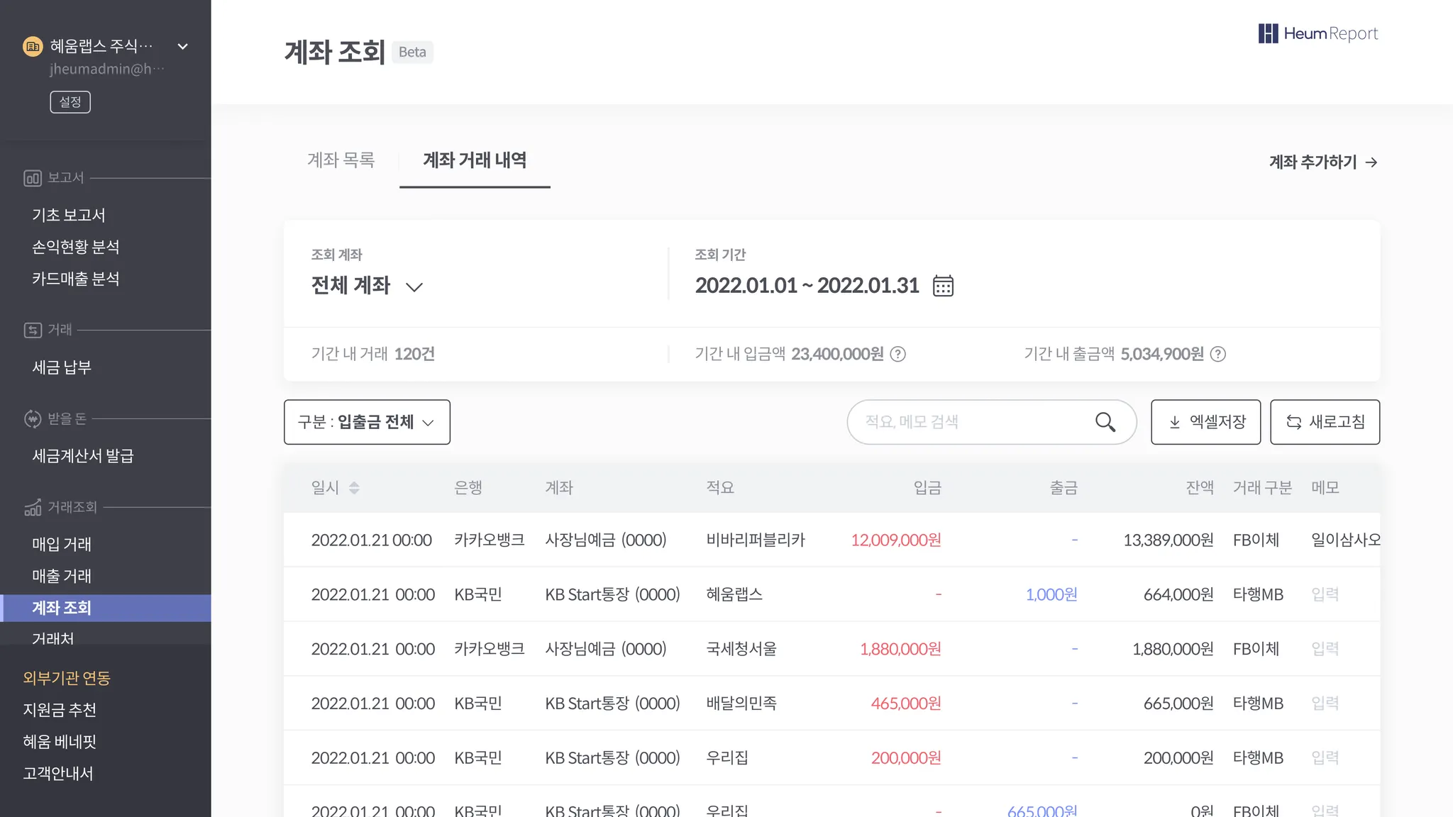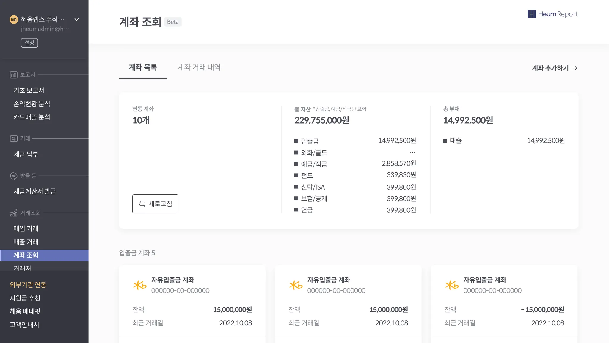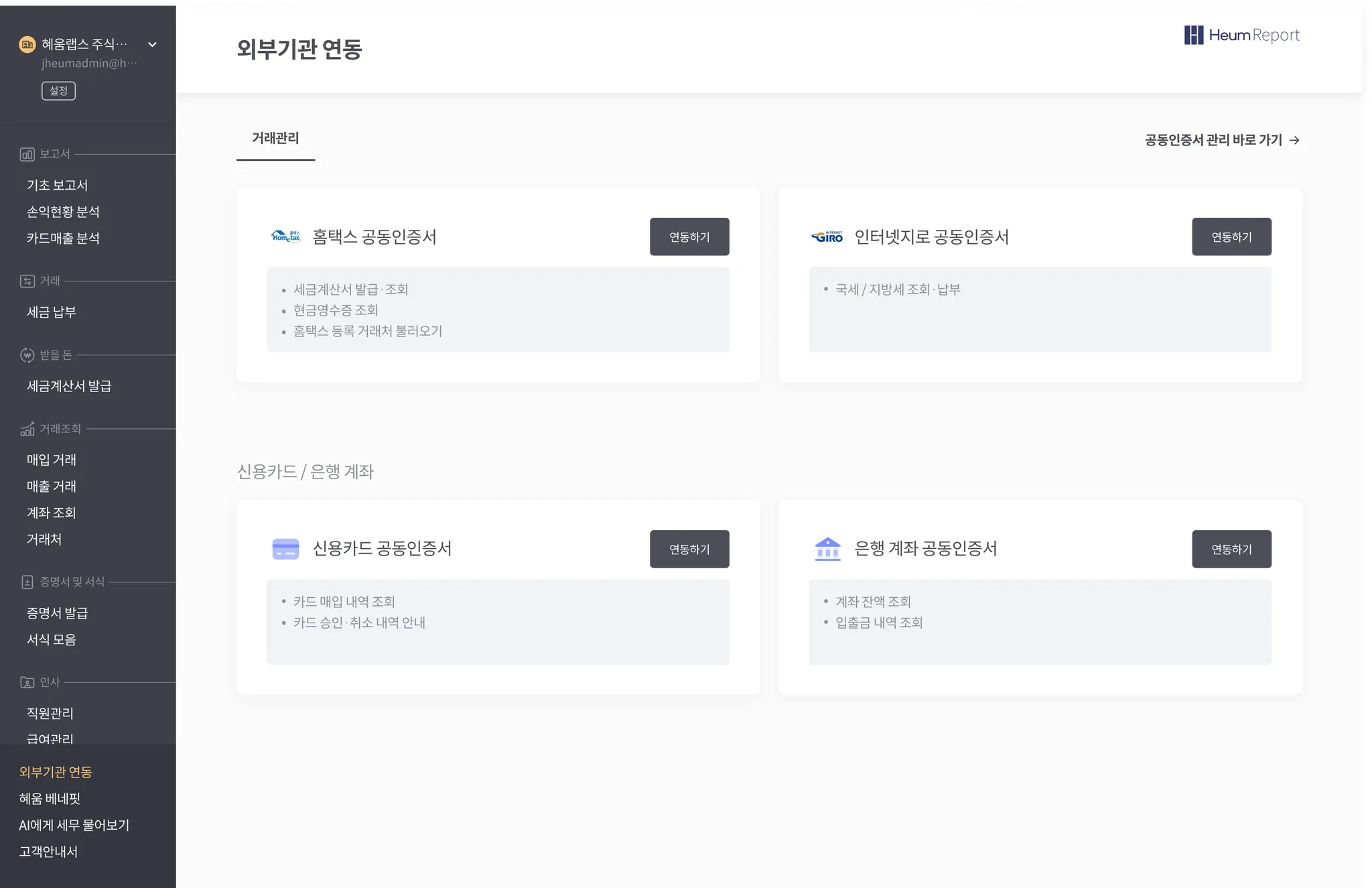 인증서 기반으로 ‘은행계좌’ 연동을 통해 Heum Report에서 계좌 거래 내역을 조회/관리