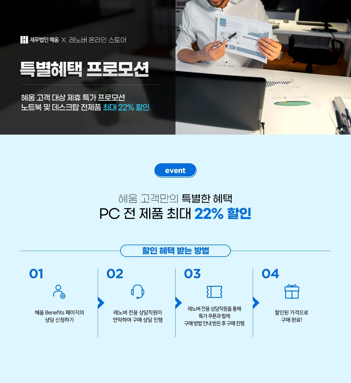 혜움 고객에게는 ThinkPad 최대 22% 할인 외에도, 기타 노트북 브랜드, 데스크탑, 워크스테이션, 올인원PC 등 다양한 제품군에 대한 18% 할인을 제공합니다.