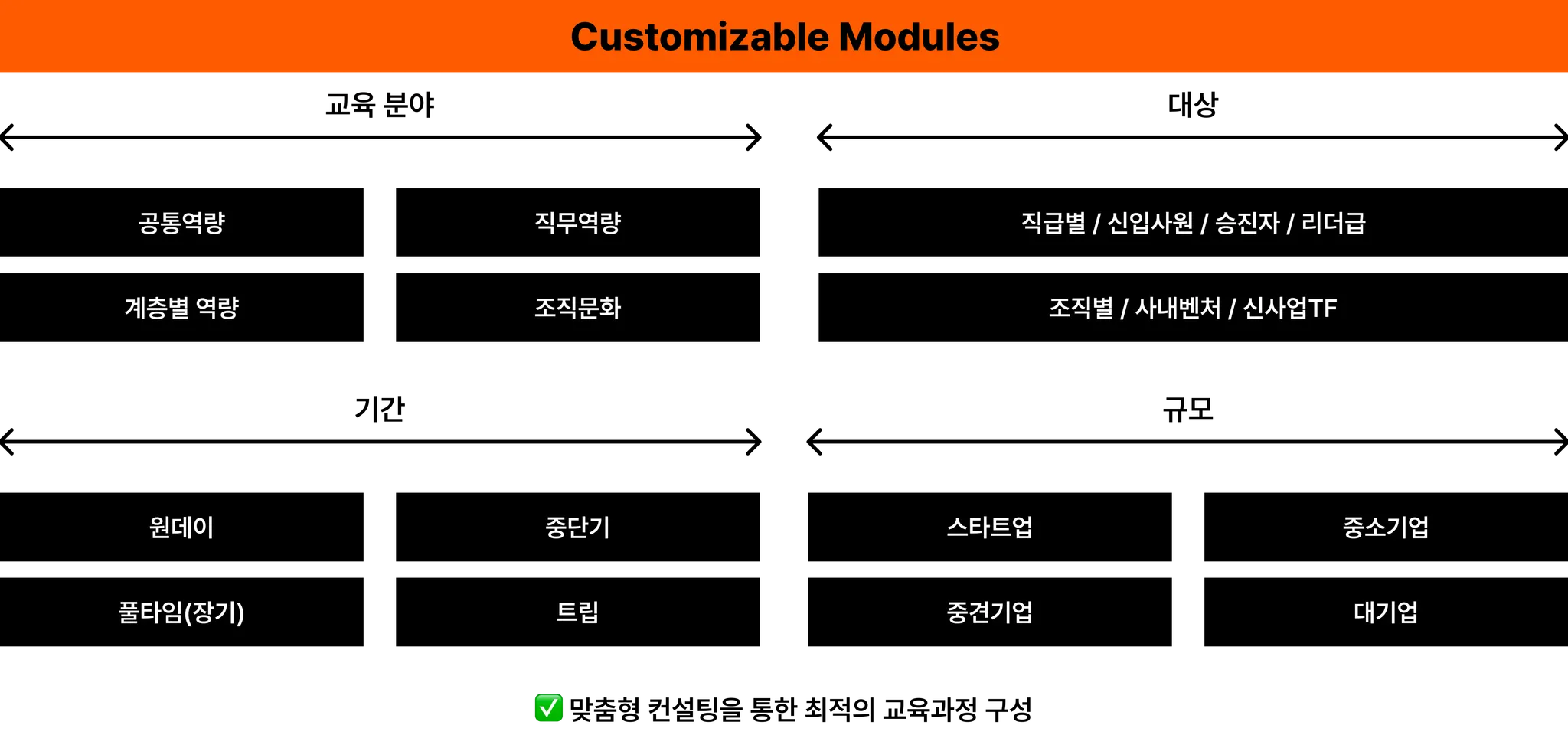 파트너사의 교육 목적, 분야, 대상, 기간, 예상 등을 고려한 기획 컨설팅을 통해 1:1 맞춤형 교육 과정을 설계합니다.