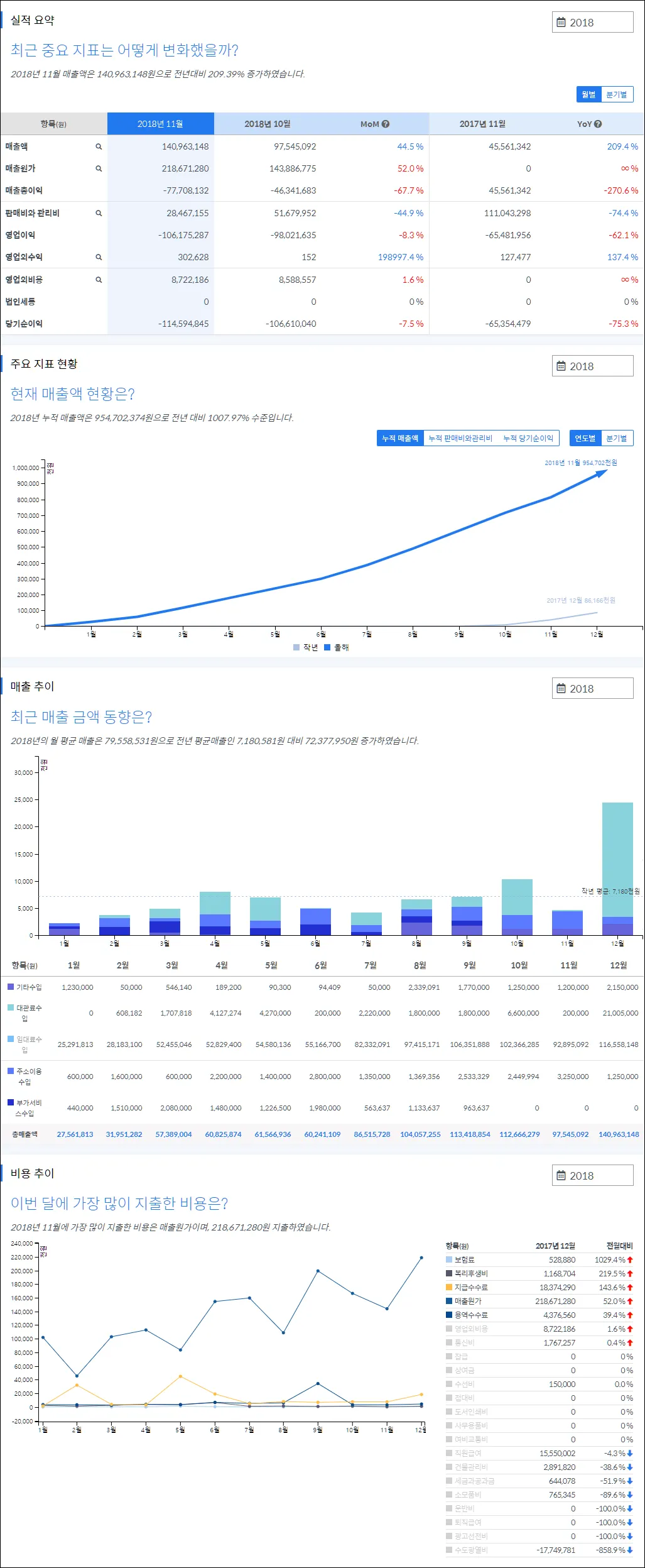혜움에서는 대표님들의 사업을 도와드리기 위하여 최근 실적, 매출액과 비용을 조회 가능한 월간 보고서를 제공하고 있습니다.