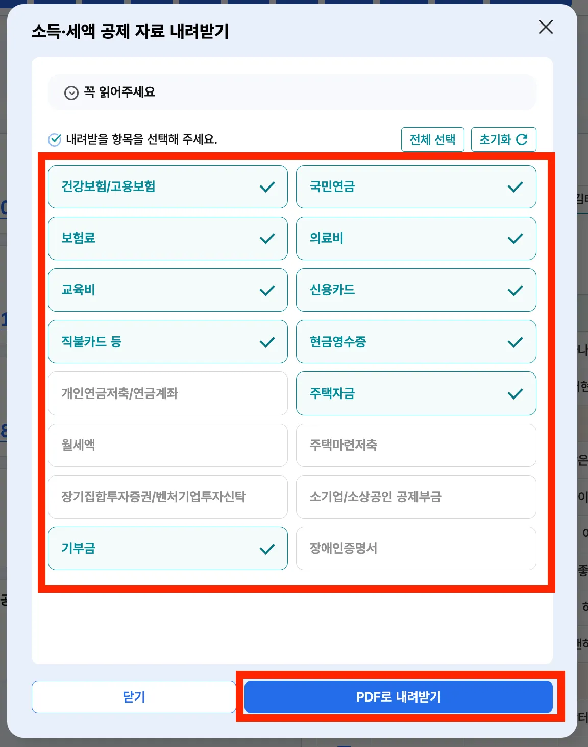 공제받고자 하는 항목을 선택하고 PDF로 내려받기 선택합니다.