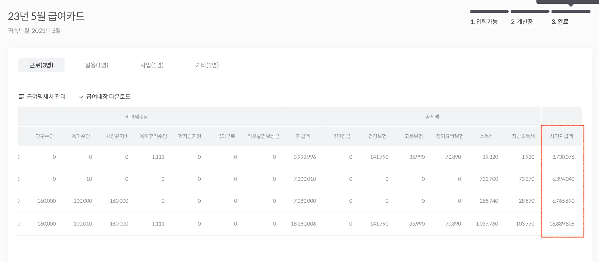 : 급여계산이 완료되어 급여 지급과 명세서 발송이 가능한 단계