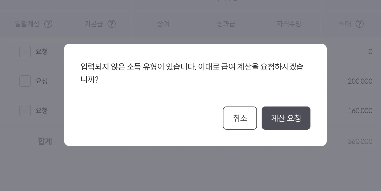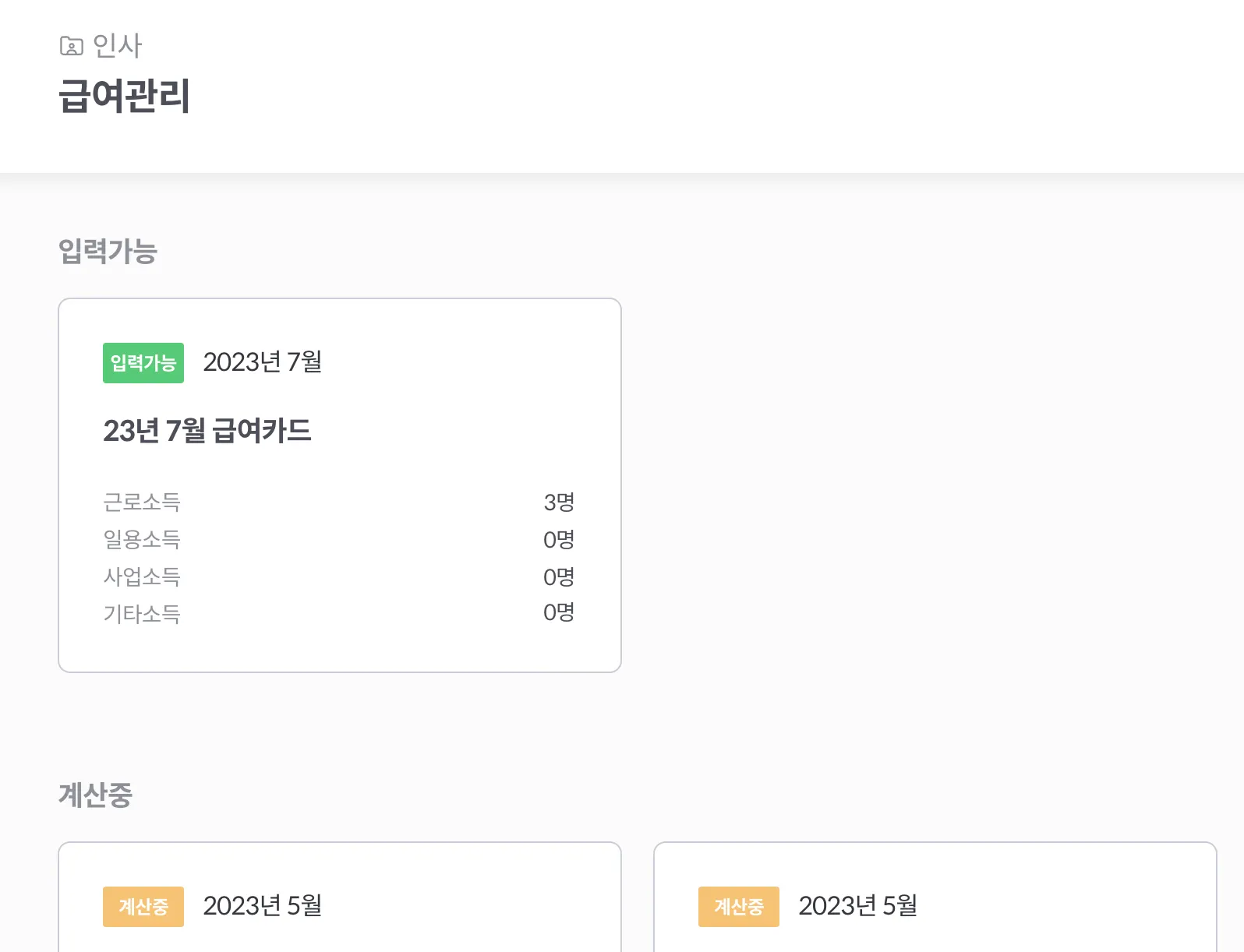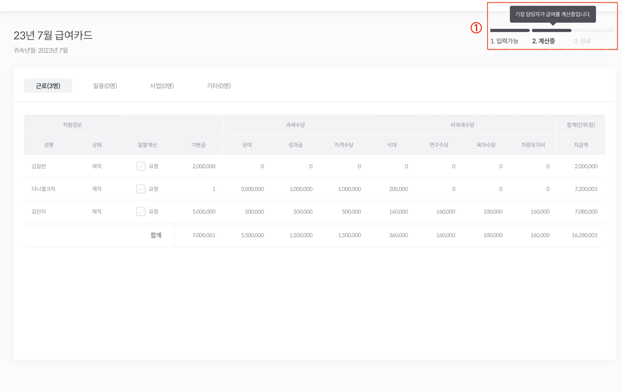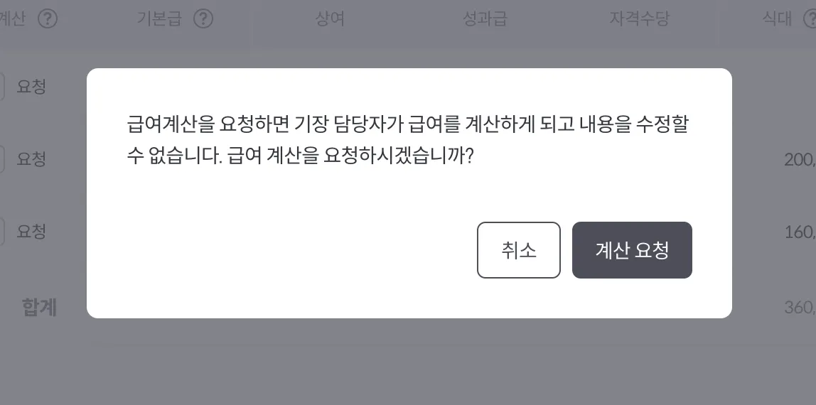 2-3. 급여 계산을 요청하면 시스템이 급여 계산을 진행하고, 1번 항목과 같이 담당자가 확인을 진행합니다. 이 경우 입력된 급여 수정이 불가합니다. 필요 시 담당자에게 요청을 해주세요.