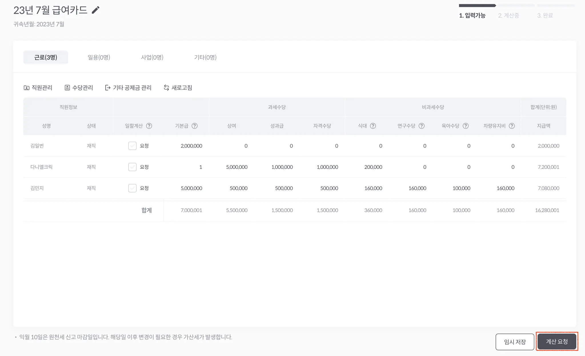 2-1. 급여 입력이 완료되면 하단의 [계산요청] 버튼을 누르고,