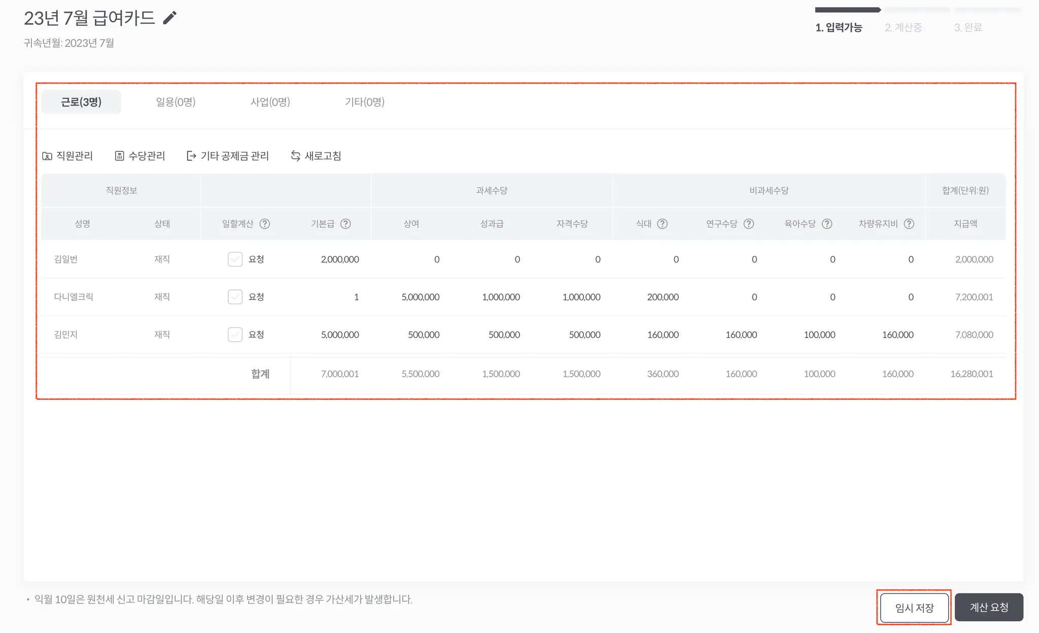 1-2. 각 소득에 해당하는 근로자의 인적사항, 급여사항을 입력합니다. 임시저장이 필요 시 아래 [임시저장] 버튼을 입력하면 저장됩니다.