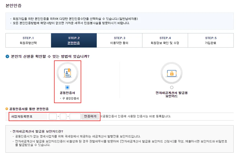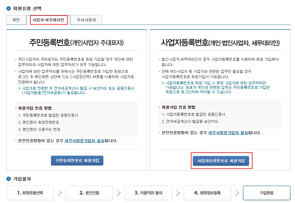 2. 회원유형 선택 > 사업자·세무대리인 > 사업자등록번호로 회원가입