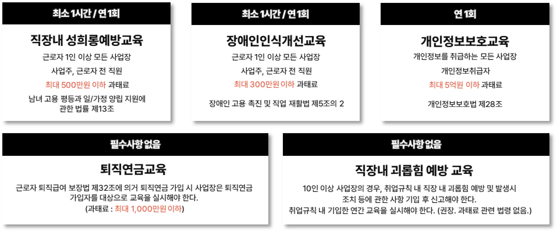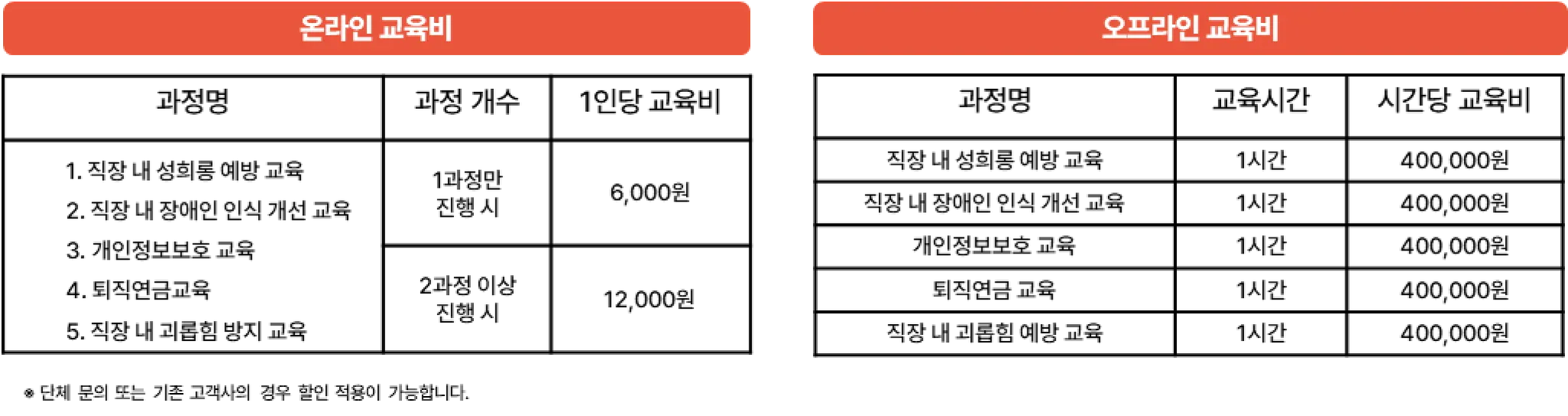 파트너사가 사업에만 집중하실 수 있도록, 번거로운 절차 없이 기업에 꼭 필요한 법정교육만 제공해드립니다.