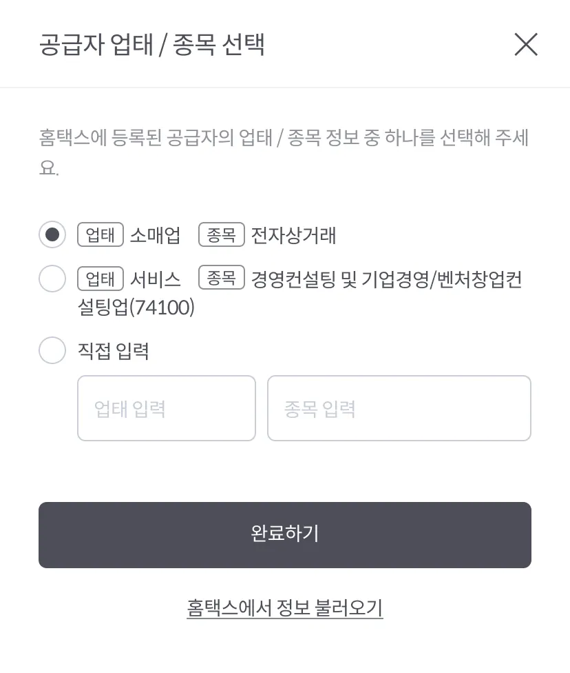 홈택스에 등록된 주업태/부업태 목록을 확인 후에 선택할 수 있음