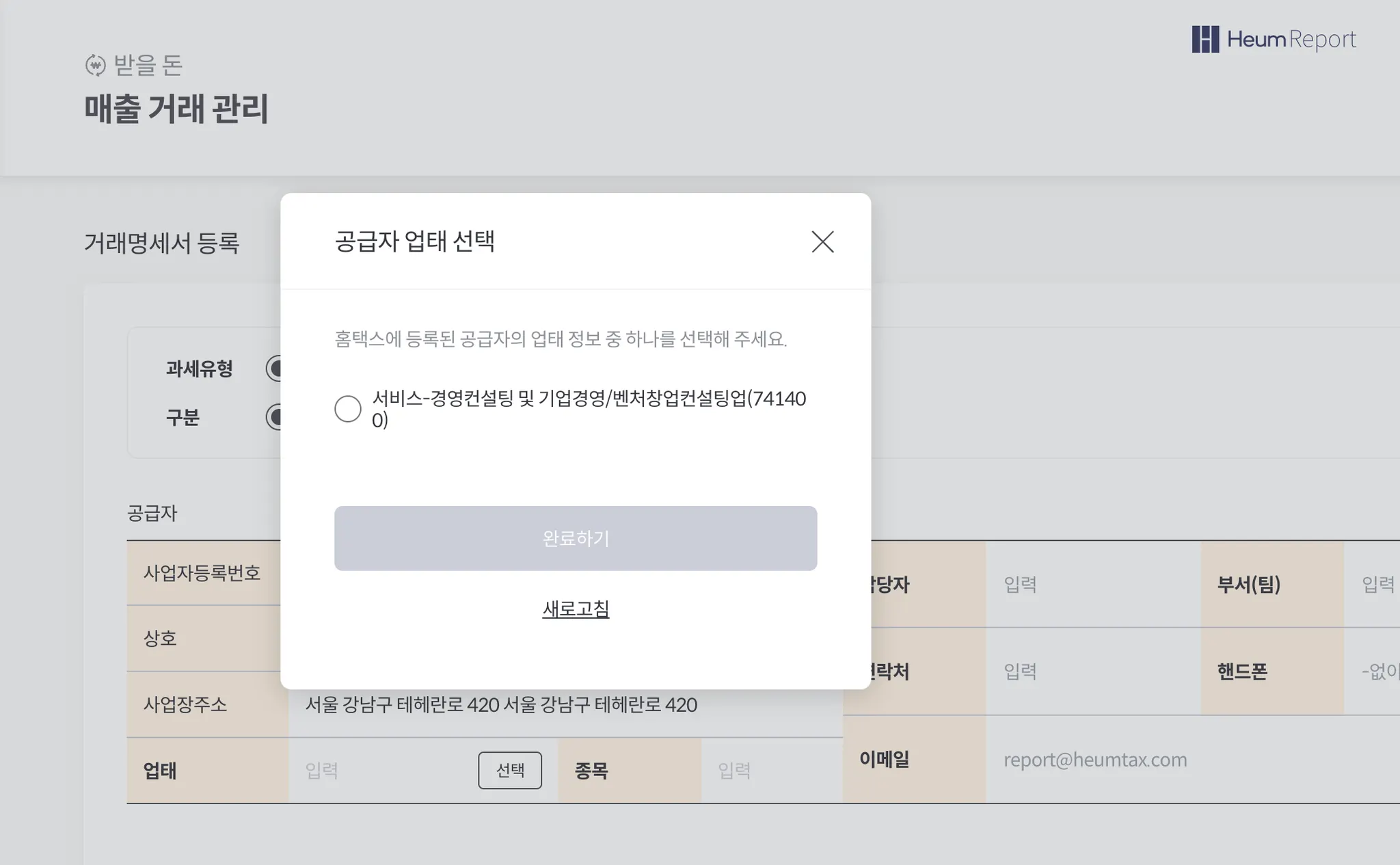 [세금계산서 발급 > 거래명세서 등록] 메뉴에서 ‘공급자 업태’ 선택 팝업에서