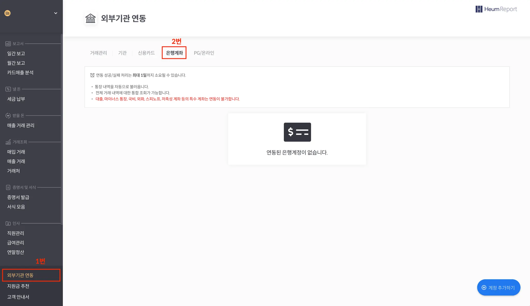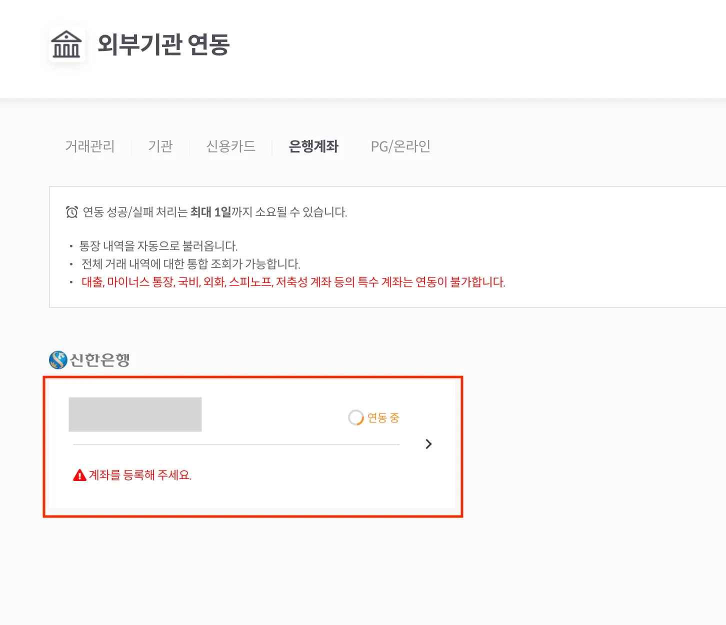 은행 거래내역을 조회하기 위해 개별 은행계좌와의 계정 연동이 필요합니다.