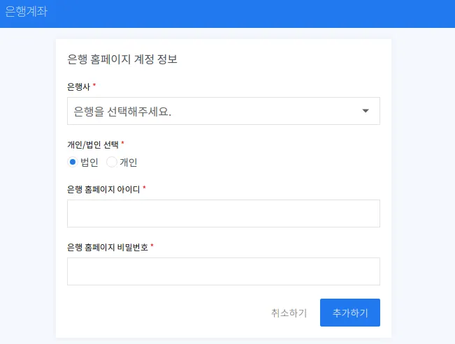 은행을 선택한 후, 연동에 필요한 정보를 입력하고, 추가하기 버튼을 클릭 해 주세요.