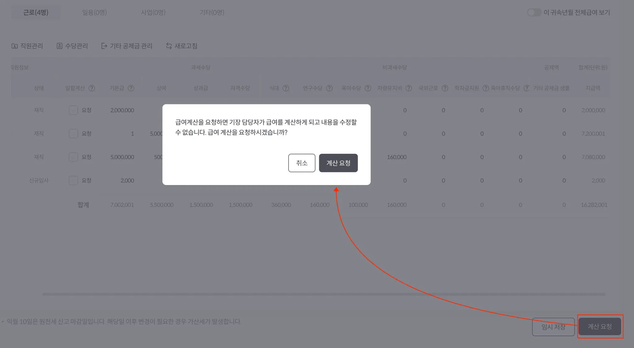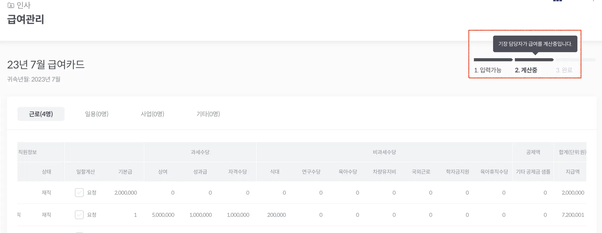 4. 계산 요청 상태로 변경되며, <급여관리> 메뉴 선택 시 해당 급여카드가 계산중 상태로 변경된 것을 확인할 수 있습니다.