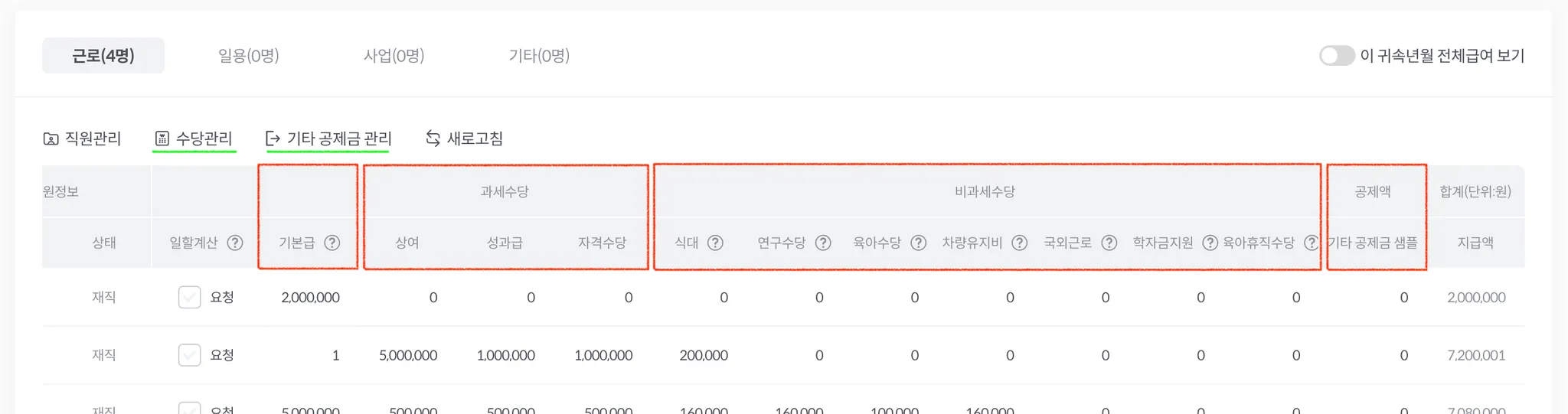 2. 근로 탭을 선택 후 근로자별 기본급, 과세수당, 비과세수당 등을 항목을 입력합니다.