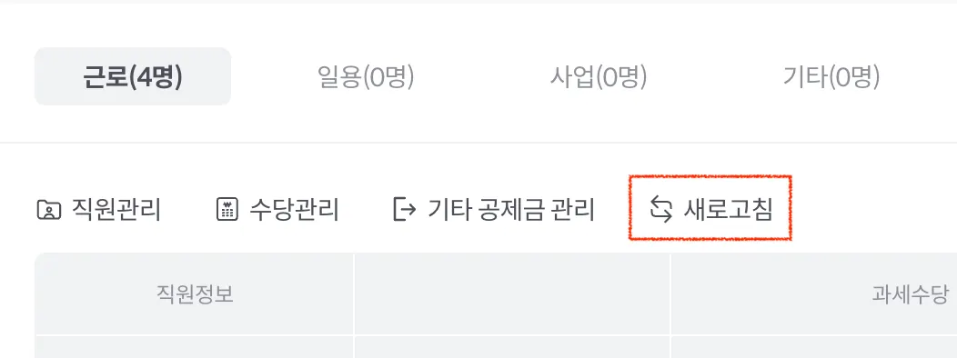 아래 새로고침 버튼을 통해서 입사자/퇴사자 직원 리스트를 최신화 할 수 있습니다.